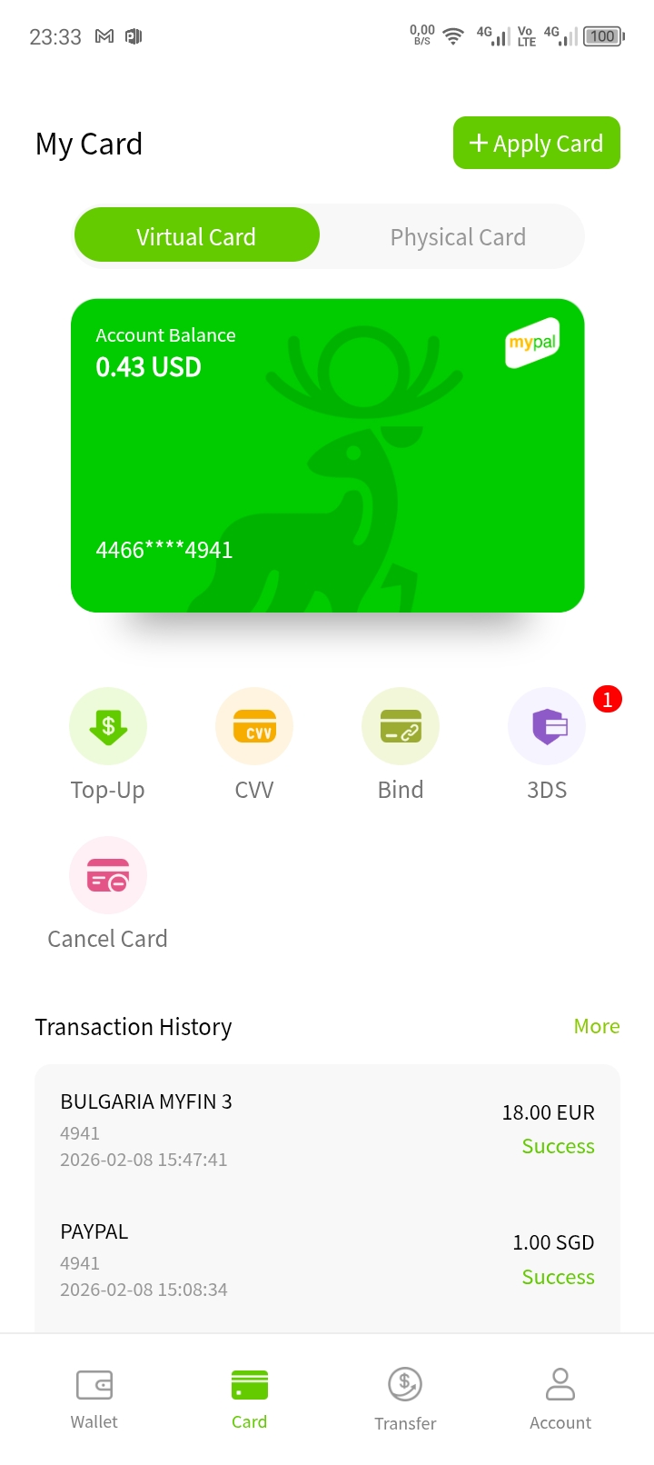 والآن بعد الحصول الى البطاقة … قمنا بتجربتها من خلال ربطها بالبايبال و استعمالها في شحن حساب MYFIN فنجحت العملية وتأكدنا من أنها بطاقة عالمية بامتياز