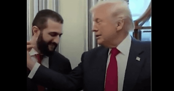 أظهر مقطع فيديو من لقاء في البيت الأبيض الرئيس الأميركي دونالد ترامب وهو يرش عطرا من مجموعته الخاصة على الرئيس السوري أحمد الشرع، قبل أن يقدمه له كهدية.