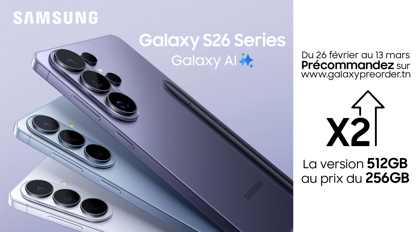 تتوافر أجهزة Galaxy S26  وGalaxy S26+ وGalaxy S26 Ultra للطلب المسبق اعتباراً من يوم 25 فيفري https://www.galaxypreorder.tn/عبر