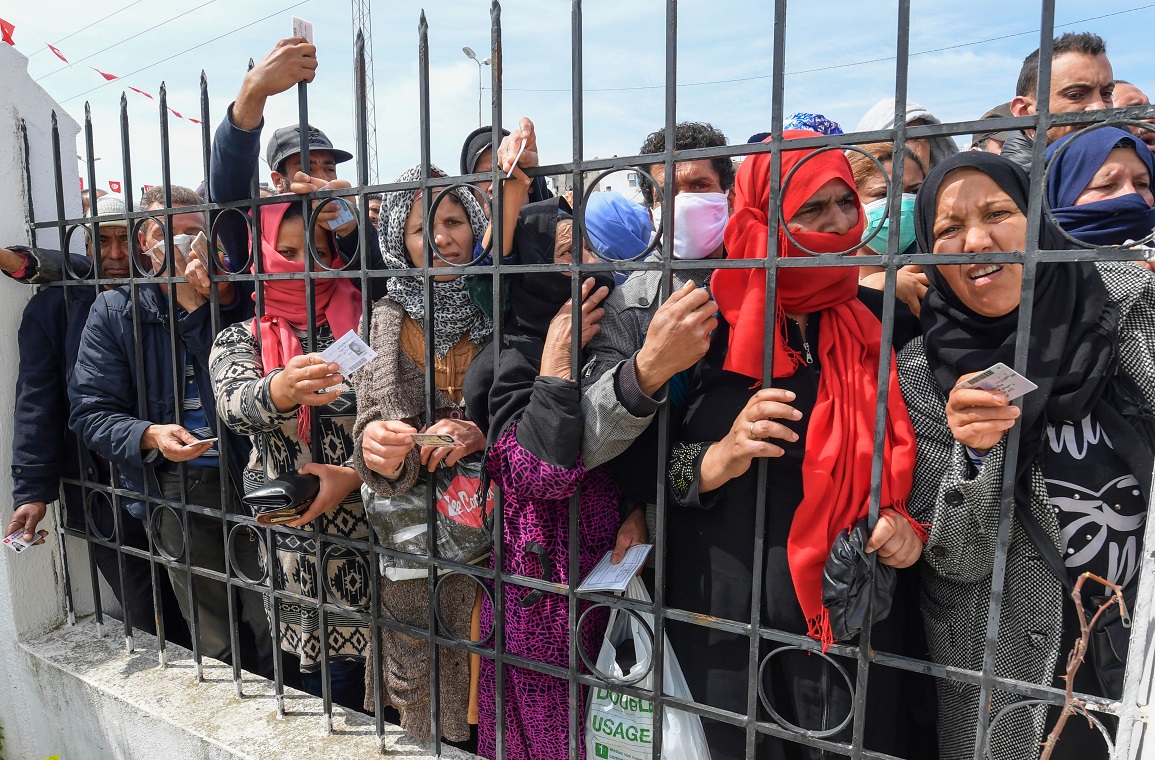 Impoverished Tunisian citizens gather with their identification cards in front of the headquarters of Mnihla delegation in Ariana Governorate outside Tunis on March 30, 2020, to protest against the general confinement and to claim the financial aid promised by the government. - Several hundred Tunisians demonstrated in a working class neighbourhood of Tunis, demanding promised government support and protesting a week-old lockdown against the coronavirus pandemic that has disproportionately impacted the poor. (Photo by FETHI BELAID / AFP) (Photo by FETHI BELAID/AFP via Getty Images)