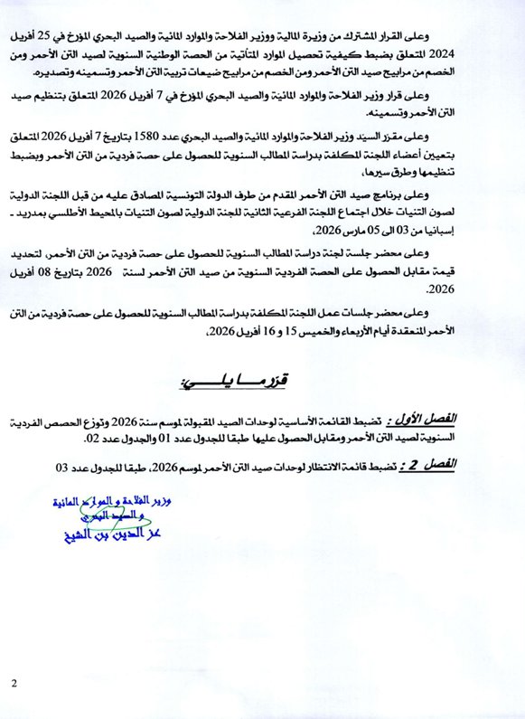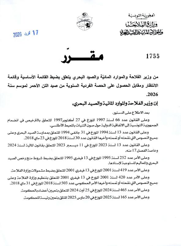 أصدرت وزارة الفلاحة والموارد المائية والصيد البحري الجمعة 17 أفريل 2026، المتعلق بضبط القائمة الأساسية وقائمة الانتظار ومقابل الحصول على الحصة الفردية السنوية من صيد التن الاحمر لموسم سنة 2026.